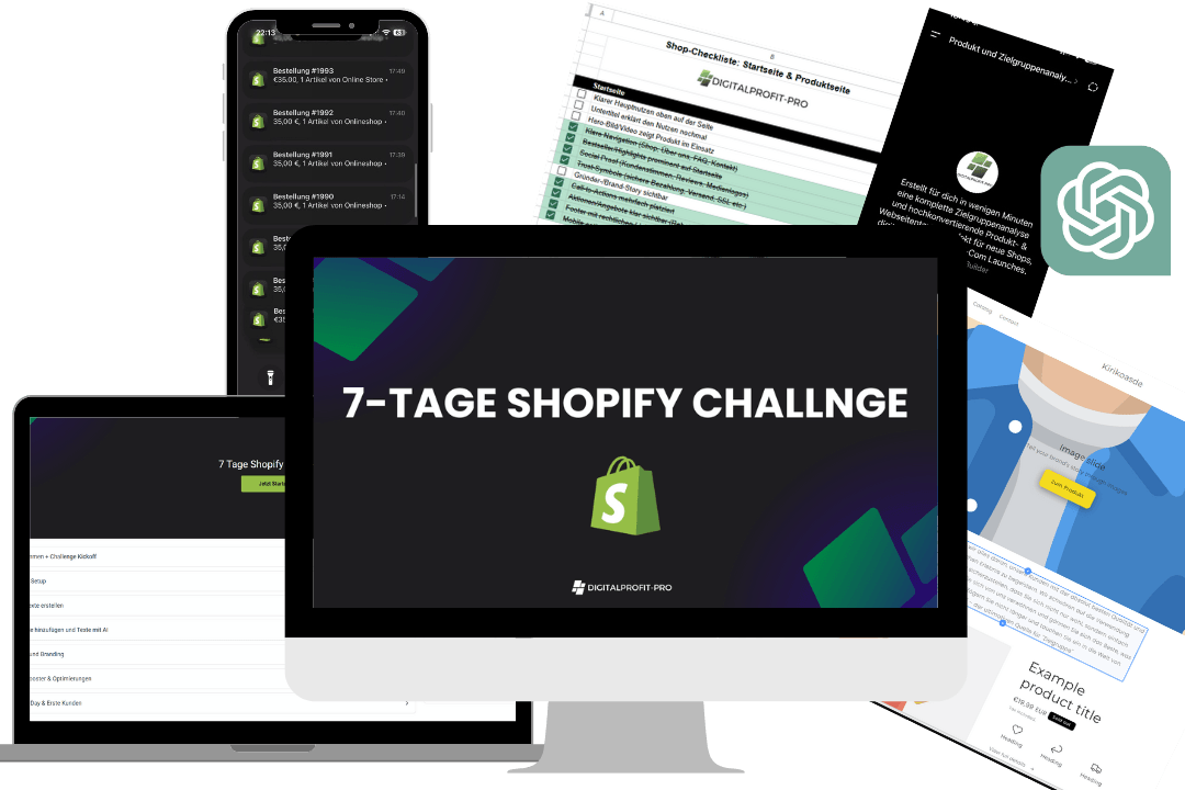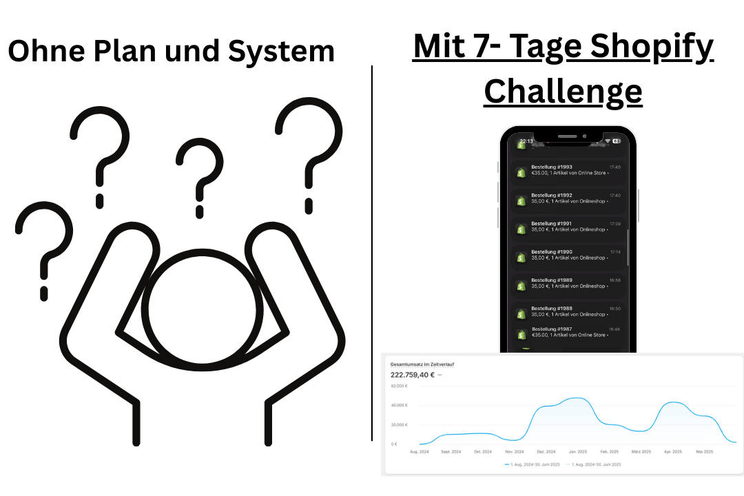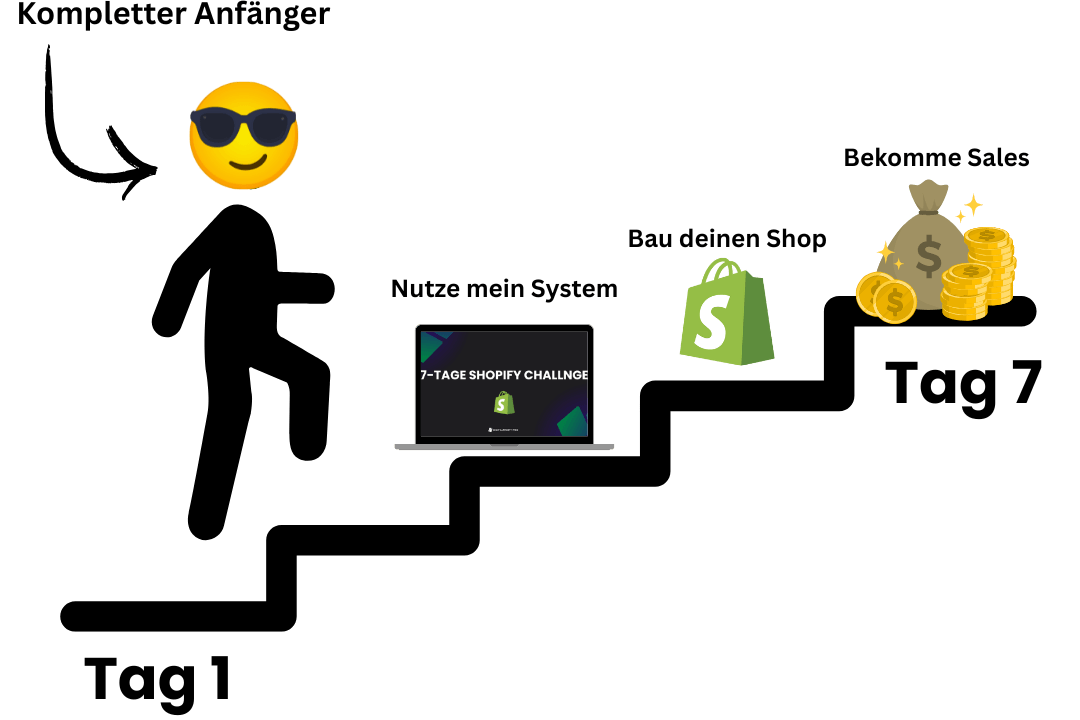 In der 7-Tage Challenge bekommst du täglich eine klare Aufgabe, um deinen eigenen Shopify-Shop aufzubauen von 0 auf startklar.